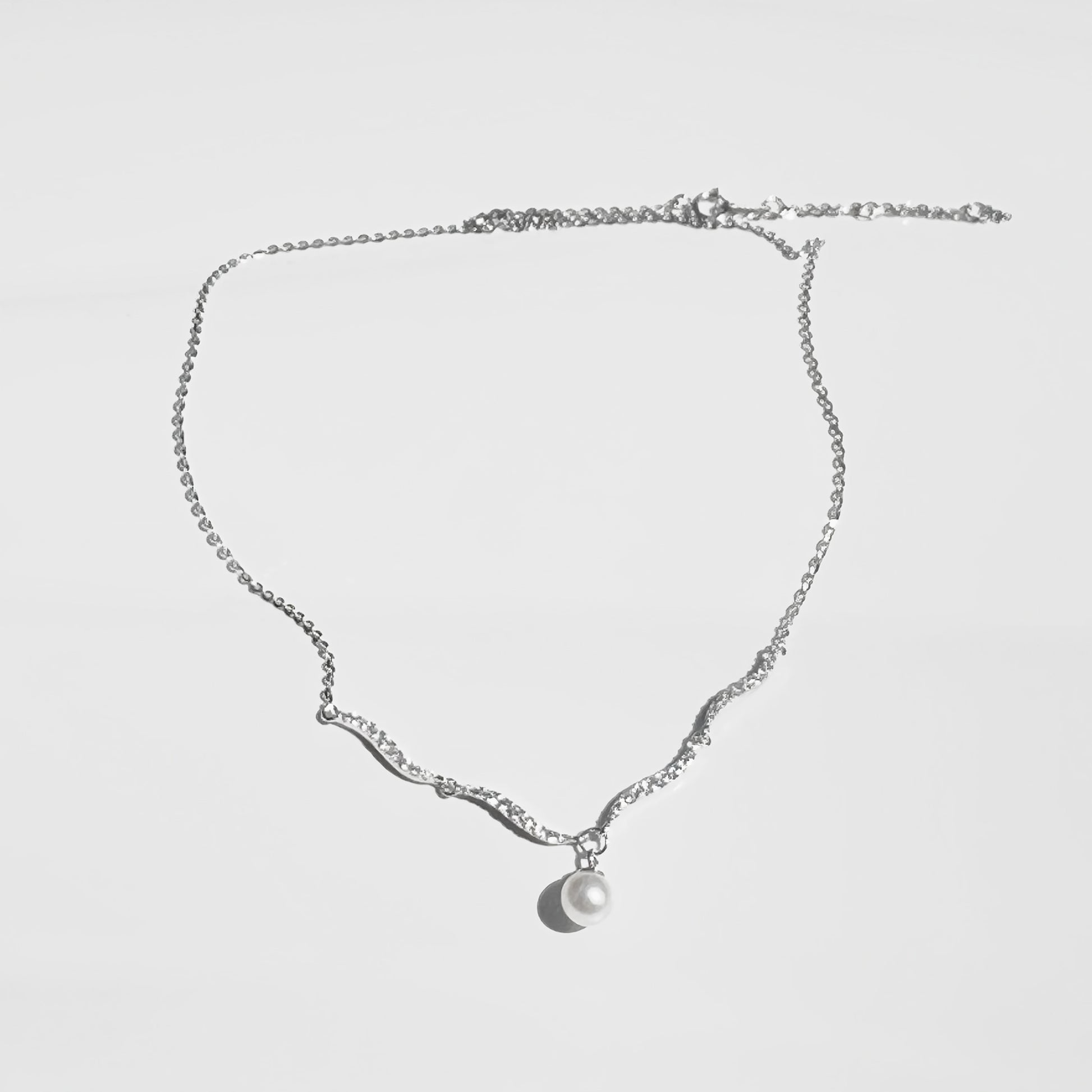 A delicate statement of modern elegance. The Eira Pearl Necklace features a luminous freshwater pearl gracefully suspended from a flowing 925 silver chain, designed with subtle organic curves that catch the light with every movement.